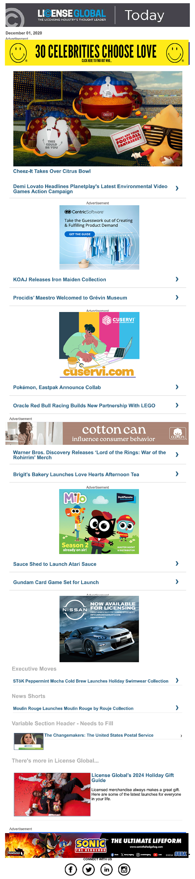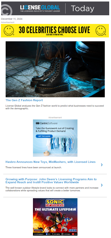 Get your message delivered straight to the inbox of key vertical decision makers from every major licensed consumer product category with ad placements in one of our industry-leading newsletters including: